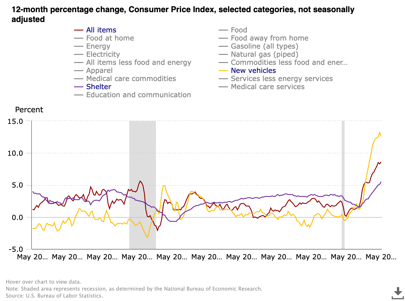 We have a new CPI print today which sent markets into a week-ending nosedive. 8.6% for May puts inflation for consumers near where it was in 1981 before the Volcker Fed cranked rates to an eye-watering 17+%. For as painful as rate increases are right now we have light years to travel before anything even remotely resembling the 80’s, nostalgia for Soviet conflict and striped shirts notwithstanding. This chart from the US Bureau of Labor Statistics compares CPI in total against two of the three components that seem ripe for a nasty mean reversion, the third being energy which we covered in the last chart and commentary. Shelter has broken out, rising to 5.5% which exceeds the lusty moments before the housing market imploded with the Financial Crisis. We have been pointing out repeatedly that there are two major moving parts driving increases in shelter -- the speculative fervor over single family housing fueled by low rates, urban migration and non-human (e.g. investment fund) buyers, and the inevitable upward correction in rentals after ending pandemic moratoria on rent, rent increases and evictions. It seems likely that the single family bubble is nearing its bursting point especially as the Fed acts, but rent will continue to grind higher as the economy digests the rental disruptions of the pandemic. New vehicles on the other hand appear perched on the precipice. Supply chain disruptions, particularly for microchips, have tightened supply and handed dealers tremendous pricing power even while makers have largely kept their price increases steady (but have been able to slow or suspend aggressive promotional programs). The rate of increase peaked at 13.2% in April and posted 12.6% for May. Other than playing demand catch-up after the market for new vehicles crashed in the depths of the Financial Crisis, the 12-month change over the last 20 years has stayed in a band of +/- 2%, and most of the time close to zero. There will come a moment when makers catch up and inventory will be abundant (and auto loan and lease rates will be higher), and the market may well punish the dealers for exploiting the situation, potentially severely. [Chart courtesy US BLS, CPI All Items, Shelter and New Vehicles, May 2002 to May 2022].