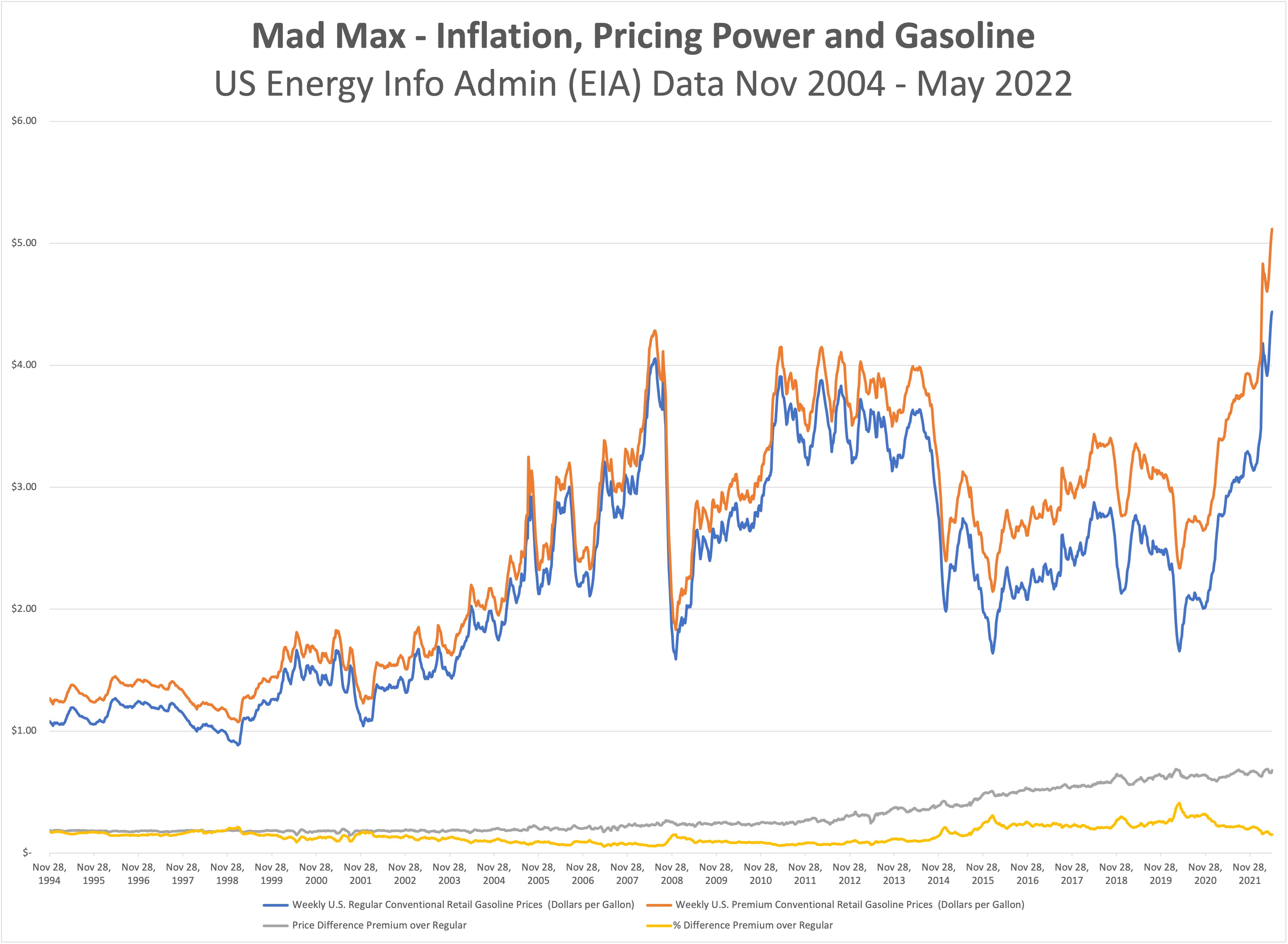 What’s up with gas? Inflation is everywhere, but it is hard to normalize when we are having the breakfast table conversations about how much prices have climbed. Our shopping carts are different from each other’s and aren’t always consistent from one trip to the next, but we get a general sense that the final tally is higher but the receipt isn’t any longer. One thing most of us, with the exception of certain urban dwellers and the small population of EV drivers, do have in common though is the price of gas. There is some geographic dispersion because of cost of delivery and local/state taxes, but we all buy the same three or four grades of gasoline, measure it in gallons, pay for it in dollars, and unless we change vehicles from one fill to the next, consume it at roughly the same rate per mile driven. This chart won’t reveal the mysteries of why prices are up, but there are a few interesting takeaways that show that there aren’t likely any easy answers. Maybe the most notable observation is that gasoline has gotten more expensive than the prior all-time peak in 2008 (about 11% higher right now). What isn’t on the graph is that oil (WTI Cushing) is about 21% cheaper than it was during the ’08 bubble. Back to the chart, we can see that the spread between premium and regular gas has been steadily grinding higher for years, with few interruptions in the relationship outside of brief reactions to the Tech Bubble, 9/11, the Financial Crisis, etc. For those old enough to remember, it was bankable that mid-grade was 10 cents more than regular, and premium was ten cents more than that. Now that premium/regular spread hovers between 65 and 70 cents, today and two years ago when everyone was hunkered down at home. These figures would indicate that the petro industry still enjoys tremendous pricing power. When thinking about inflation it is important to consider what the drivers are and who gets hurt, but also who benefits. It was almost exactly 11 years ago when WTI was the same price it is today ($112/bbl). Regular was $3.91, and Premium was $4.15. Today at $112/bbl, Regular is $